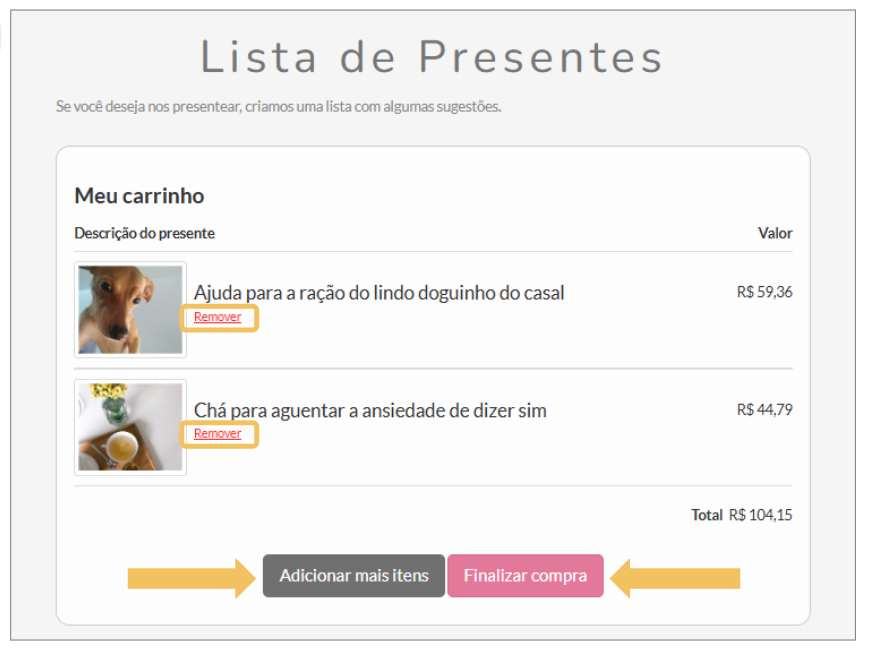 Se desejar remover algum presente do carrinho, basta clicar no botão “Remover”, que aparece logo abaixo do nome do item.