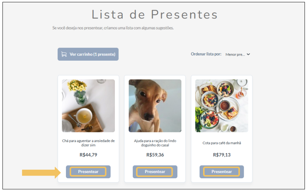 Já no site do casal, vá até a página "Lista de Presentes". Ao escolher o item desejado, clique em "Presentear" para selecioná-lo.