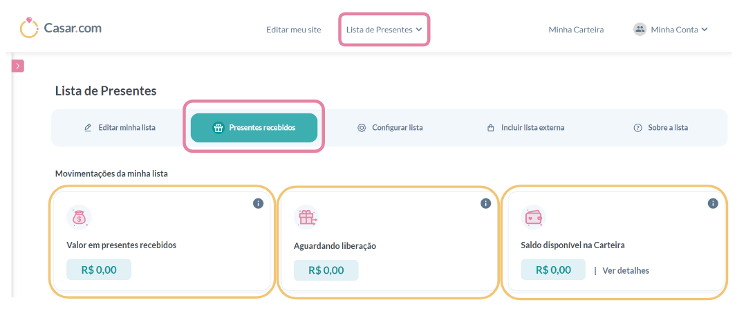 - Valor em presentes recebidos: referente ao valor total já recebido, mesmo os que ainda não foram repassados;